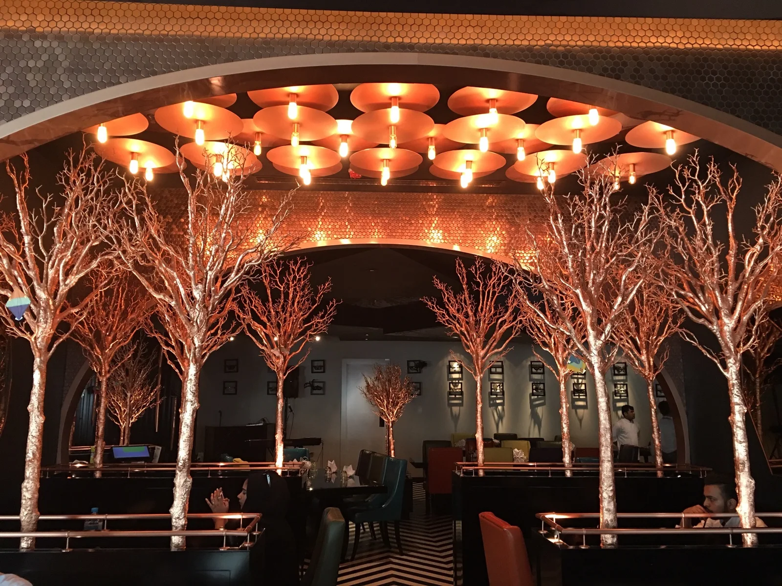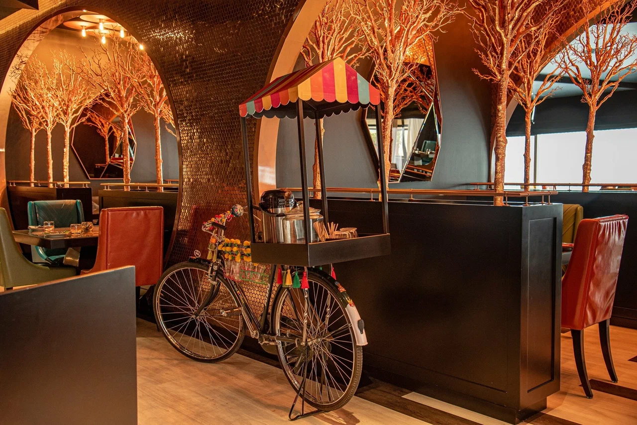 Carnival by Trèsind is a theatrical dining destination in Dubai, offering a bold and immersive culinary experience. Strategic spatial planning balances guest comfort, high-volume service, and experiential impact. Playful interiors feature chevron flooring, copper sculptural elements, asymmetrical mirrors, and signature bar installations.
